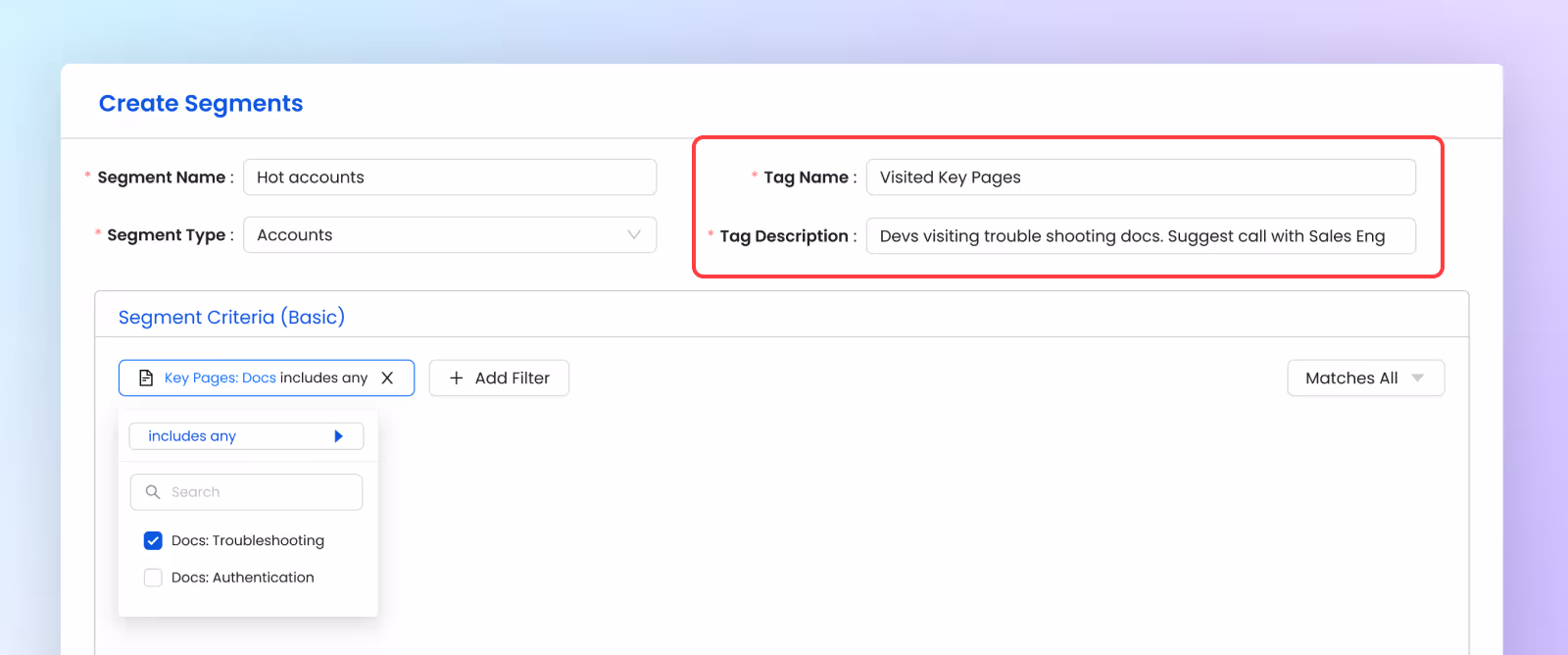 Step 2: After specifying the Key Pages, you can create an account or developer segment by using the Key Docs Pages Filter. This allows you to segment accounts/developers based on their activity on those critical pages.
